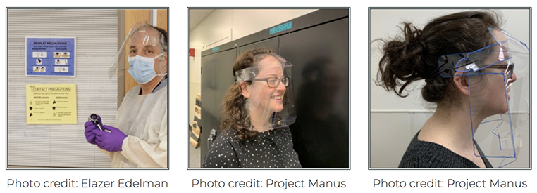 Utilizando el diseño diseñado por MIT (Instituto Tecnológico de Massachusetts) Project Manus, el escudo se fabrica en un diseño plano de una sola pieza, lo que facilita que los hospitales y profesionales de la salud se distribuyan rápidamente a sus empleados. Una vez que estas cajas de láminas planas de película de plástico llegan al destino prometido, los profesionales de la salud pueden doblarlas fácilmente en escudos 3D en solo 90 segundos antes de ajustarlas adecuadamente para que se ajusten a sus caras. Luego se pueden organizar en ubicaciones para su recogida dentro de los hospitales, según el criterio de esas ubicaciones.