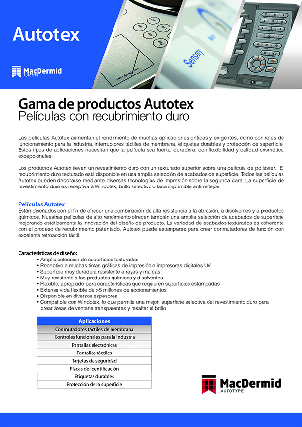 Están diseñados con el fin de ofrecer una combinación de alta resistencia a la abrasión, a disolventes y a productos químicos. Nuestras películas de alto rendimiento ofrecen también una amplia selección de acabados de superficie mejorando estéticamente la innovación del diseño de producto. La variedad de acabados texturados es coherente con el proceso de recubrimiento patentado. Autotex puede estamparse para crear conmutadores de función con excelente retroacción táctil.